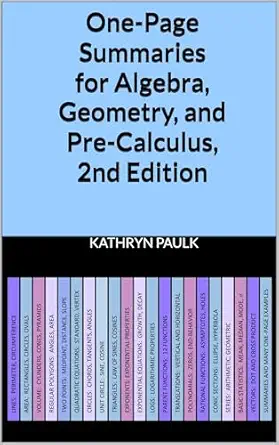 This book contains a set of one-page summaries and problem examples for important math topics covered in Algebra, Geometry, and Pre-Calculus. Current students may use the summaries and examples to reinforce material learned in class. The concentrated, one-page math summaries give students an excellent overview of the material and may provide new insights. Students planning to take SAT exams or higher-level math courses may use the summaries for review and reference. Summaries and examples for the following topics are included: Lines – Perimeter, Pythagorean TheoremArea – Rectangles, Triangles, Circles, OvalsVolume – Cylinder, Pyramid, SphereRegular Polygons – Angles, Sides, AreaTwo Points – Distance, Midpoint, Eqn. of a LineLinear Eqns. – Slope Intercept, Point Slope, & Std. FormQuadratic Eqns. – Standard, Vertex, & Factored FormGeometry Circles – Angles, Chord, Tangent LinesUnit Circle – Degrees, RadiansTriangles – Law of Sines, Law of CosinesExponents – RulesFactoring – Squares, Cubes, Binomial ExpansionExponential Functions – Decay and GrowthLogarithms -- Product, Quotient, & Power PropertiesParent Functions -- Graphs of 12 standard functionsTranslations -- Vertical and HorizontalGraphing Polynomials -- Zeros, Mult., End BehaviorGraphing Rational Functions – Asymptotes, HolesConic Sections – Parabola, Ellipse, HyperbolaSeries – Arithmetic and GeometricBasic Statistics – Mean, Median, Mode, Std. Dev.Vectors – Dot Product, Cross ProductComplex Numbers -- Rectangular & Polar FormPolar Curves -- Circle, Spiral, Rose, LimaconSymbolic Logic – Boolean AlgebraPolynomial Division – Long and Synthetic The first edition (yellow cover) has all summaries grouped together in Part 1 and all examples grouped together in Part 2. The second edition (blue cover) has all summaries and examples grouped together for each math topic. Additionally, the second edition is formatted to provide a better eBook (Kindle) reading experience. ...