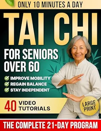 🎁 EXCLUSIVE BONUS INCLUDED: Complete "Mindful Breathing & Relaxation Practices" Chapter — Calm your mind, ease tension, and sleep better while your body grows stronger!A single slip can change everything.But in just 21 days, you can start feeling steady, safe, and secure in your independence.Imagine walking confidently again, free from the fear of falling, moving through your day without stiffness or hesitation.Most Tai Chi programs take 28 or 30 days to complete — and for many seniors, that’s simply too long. This book is different. It gives you real improvements faster.With 10-Minute Tai Chi for Seniors Over 60, you'll discover a proven 21-day system that rebuilds balance, prevents falls, eases joint pain, and restores your confidence—all in just 10 minutes a day.This isn’t another long, confusing fitness routine to figure out on your own. It’s a simple, follow-along system with large print, clear illustrations, and step-by-step guidance, so you always know exactly what to do—and you can practice comfortably at your own pace, whether standing or seated.Here's What Makes This Book Different:✅ The Complete 21-Day Balance & Confidence ProgramFollow a day-by-day plan with exact movements, repetitions, and rest days. No guessing—just show up for 10 minutes.✅ Large Print & Clear Illustrations You Can Actually SeeEvery page designed for easy reading with step-by-step photos showing exactly what to do.✅ Video Library Included (40+ Demonstrations)Scan the QR code to watch flowing Tai Chi movements that complement your practice.✅ Standing AND Seated Options for Every MovementBad knee day? Low energy? Every exercise includes a chair version.✅ Mindful Breathing & Relaxation TechniquesProven breathing exercises and meditations that calm anxiety, improve sleep, and reduce tension.✅ Self-Assessment Tools & Progress TrackingMeasure your improvement with simple balance tests. See real proof of your progress.✅ Personalized Completion CertificateCelebrate your achievement with a downloadable certificate.💪 What You'll Achieve in Just 21 Days:✅ Stand longer without fatigue✅ Walk with steadier steps and better balance✅ Bend and reach without fear or strain✅ Move with less joint stiffness and pain✅ Sleep better and wake refreshed✅ Feel calmer and more in control✅ Enjoy activities you've been avoidingNo equipment needed. No experience required. No flexibility necessary.Even if you've never exercised before... Even if other programs felt too difficult... Even if you think it's "too late" to improve...This program meets you exactly where you are today.👉 Scroll up and click "Buy Now" to begin your 21-day journey to better balance, renewed confidence, and lasting freedom.Start today. Feel the difference in days. Move freely for years.
