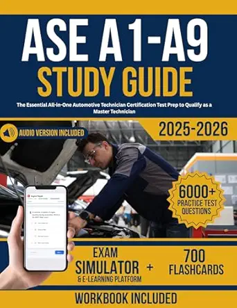 The Essential All-in-One Automotive Technician Certification Test Prep to Qualify as a MasterTechnician. Your Shortcut to ASE MasteryYou already know what it takes to keep cars on the road. You’ve diagnosed stubborn check engine lights, chased down hidden wiring faults, and rebuilt engines with nothing but grit, precision, and skill. But when it comes to passing the ASE exams, it’s not about what you can do with a wrench — it’s about what you can prove on paper.And that’s where most techs get stuck. The shop teaches you everything — except how to outsmart the test. Maybe it’s the tricky way the questions are worded. Maybe it’s the overload of dry theory. Or maybe it’s the reality of balancing long shifts, family life, and the pressure of nine separate exams. Either way, earning ASE Master Certification feels less like a tune-up — and more like a full rebuild.That’s why this book was built: to bridge the gap between real-world shop experience and ASE exam success.Introducing the ASE A1–A9 Master Technician Study Guide — Your Complete Test Prep and Career AcceleratorThis isn’t just another dense textbook. This is a technician’s blueprint for exam victory. Designed from the ground up for hardworking pros, it cuts through the clutter and delivers exactly what you need to pass every test — first time. Whether you’re prepping for Engine Repair (A1), Brakes (A5), Electrical Systems (A6), or Light Vehicle Diesel Engines (A9), this guide keeps it sharp, practical, and crystal-clearInside, you’ll discover:✅ Clear domain-by-domain breakdowns for every ASE A1–A9 test✅ Step-by-step explanations of complex systems using shop-floor language — not textbook jargon✅ Thousands of practice questions and full answer keys mirroring the official ASE format✅ Real-world diagnostic scenarios to train your brain like you’re in the bay✅ Proven study strategies tailored for busy technicians working 40–60+ hours a week✅ Updates on OBD-II, hybrid, advanced electronics, and modern systems — because cars evolve, and so should youBONUS TOOLS INCLUDED✔️ 9 Full-Length Practice Exams with detailed explanations✔️ Over 6,000 Practice Questions across all A1–A9 domains✔️ Flashcards, Workbooks, and Audio Access — so you can study in the shop, on your commute, or at the gym✔️ Exclusive Exam Simulator App and Interactive E-Learning Platform for smarter, faster prepPassing the ASE A1–A9 exams is more than a patch on your sleeve. It’s the key to higher pay, shop leadership, job security, and the professional respect that separates true master techs from the rest.This book is your battle plan. Straightforward. Tested. Effective.🎯 If you’re serious about becoming a certified ASE Master Technician, grab your copy today — and take control of your career, your income, and your future.